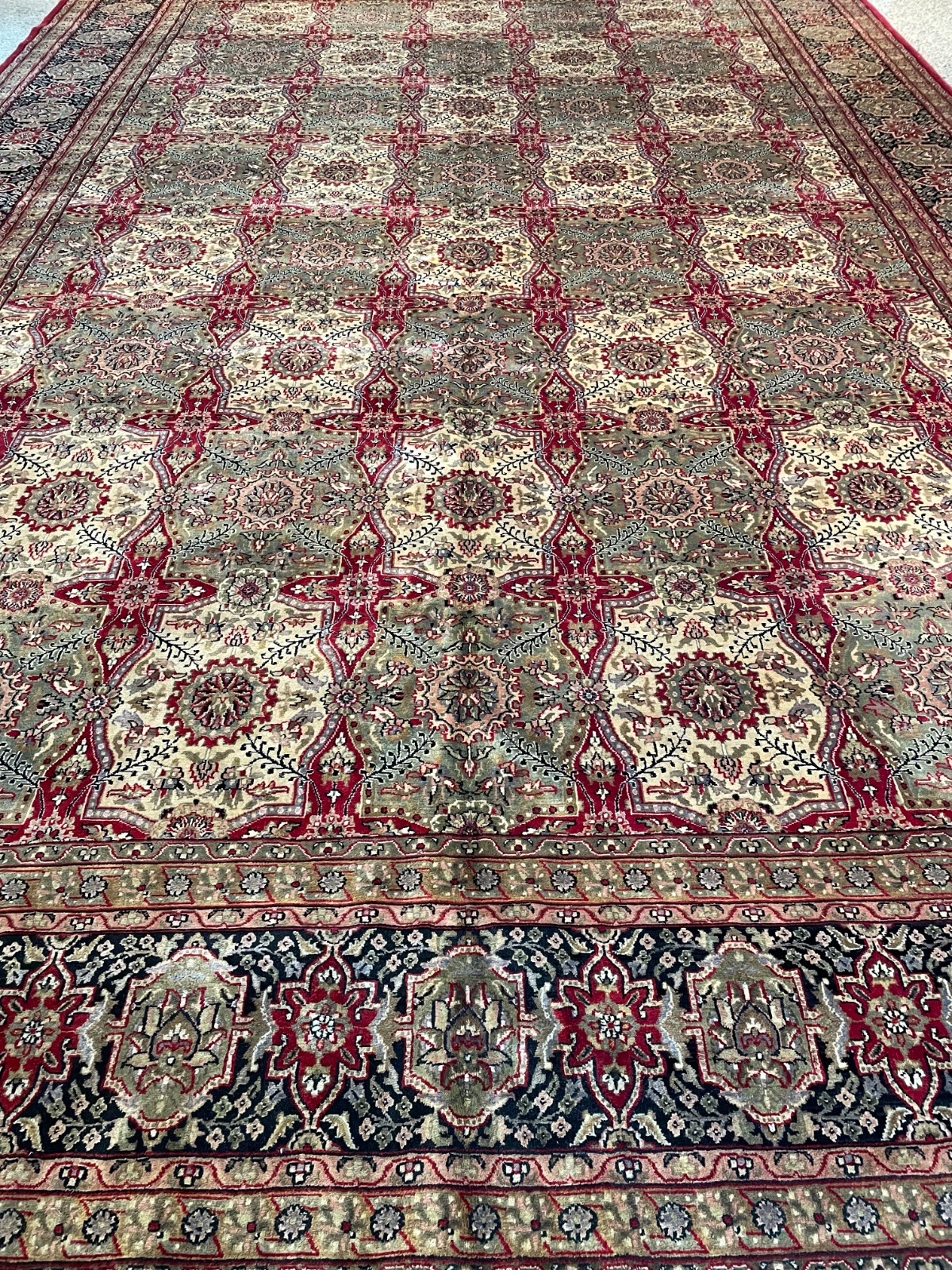 Handmade 100% wool Jaipoor rug from India, size 12x18 ft. Durable, traditional craftsmanship for timeless elegance.